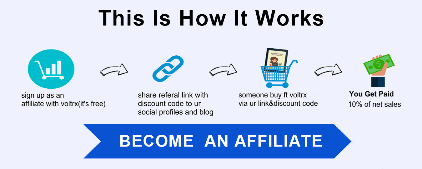 VOLTRX Affiliate Program enables every content creator to join and promote VOLTRX, gain commissions from every purchase through your affiliate link/exclusive discount code. Share your affiliate link, promote and earn commission, everyone could be a marketer on here. Apply today to join the program.