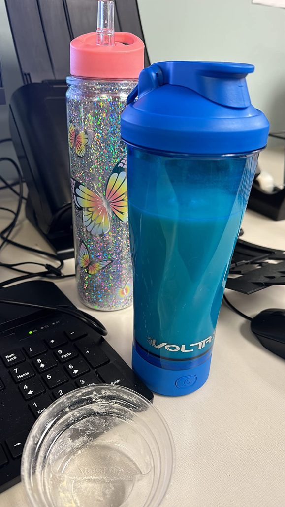 I use it at work ,the best of this is that don’t make noise ,I can be in the elevator,driving or at my job desk around co worker and they don’t even notice that I am shaking my protein shake and even stop on it’s self.♥️🥰🥰